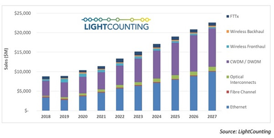 According to the latest forecast, the CAGR (compound annual growth rate) for 2022-2027 is 12% which is not too much different from the CAGR announced in October 2021 which is 13%. Strong sales of DWDM and Ethernet optics account for most of the growth in 2021, and these segments are expected to continue to lead growth in 2022-2027.